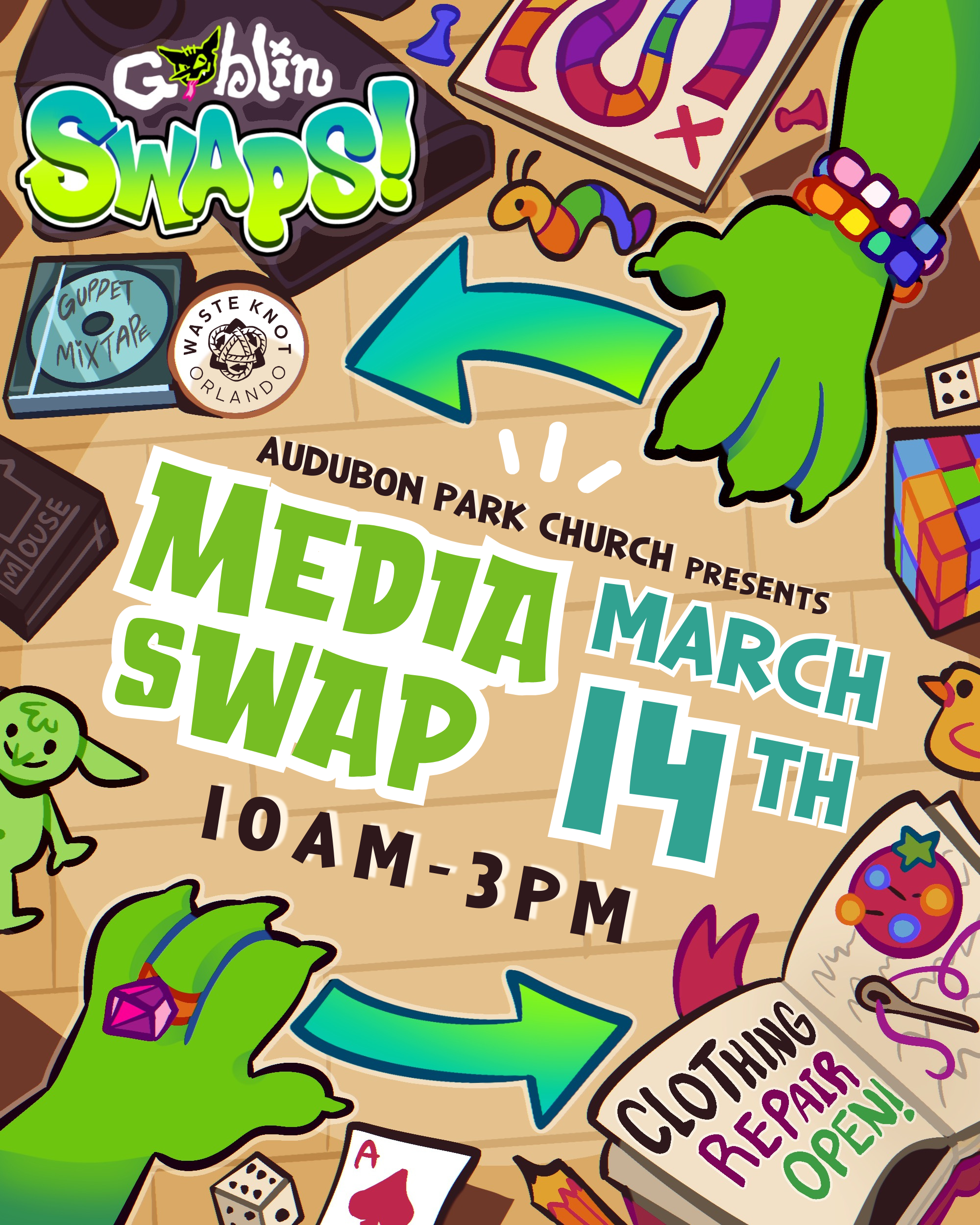 Join Waste Knot Orlando, Goblin Market, and Audubon Park Church, for the first PHYSICAL MEDIA SWAP of 2026 on March 14th from 10 am-3pm!!